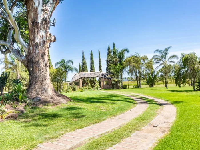 The palatial main residence boasts a magnificent modern fitted kitchen with a scullery, walk-in pantry, two double ovens, and both gas and electric stoves a chef's dream. Three spacious lounge areas provide ample room for relaxation and entertaining. The ensuite main bedroom offers a private sanctuary, while a loft-style office with a full bathroom and storeroom provides a functional workspace. A covered verandah overlooks the manicured gardens, offering a peaceful spot to enjoy the surroundings.
